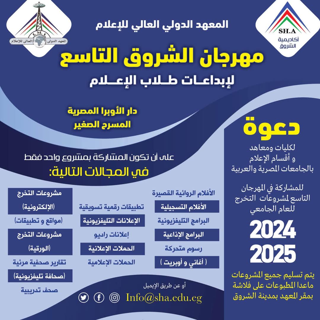 #أخبار إعلام الشروق تدعو للمشاركة في مهرجانها التاسع لإبداعات طلاب الإعلام كتب- محمد منصور: أعلن المعهد الدولي العالي للإعلام، عن فتح باب التسجيل للمشاركة في مهرجان الشروق التاسع لإبداعات طلاب الإعلام، mohamed mansour / سنة واحدة Comment (0) (743)