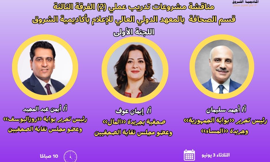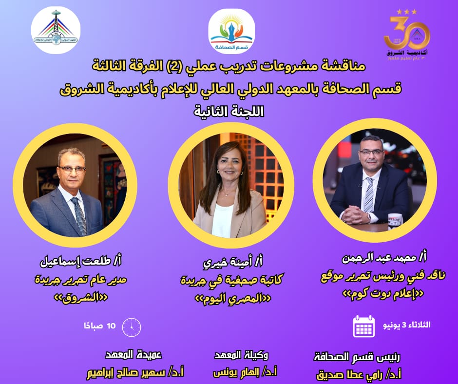 أعلن قسم الصحافة بالمعهد الدولي العالي للإعلام بأكاديمية الشروق عن تشكيل لجنة تحكيم لمناقشة وتقييم مشروعات طلاب الفرقة الثالثة في مقرر “تدريب عملي 2″، وذلك في إطار سعي القسم لربط الدراسة الأكاديمية بالتدريب المهني وتعزيز التفاعل مع المؤسسات الصحفية.