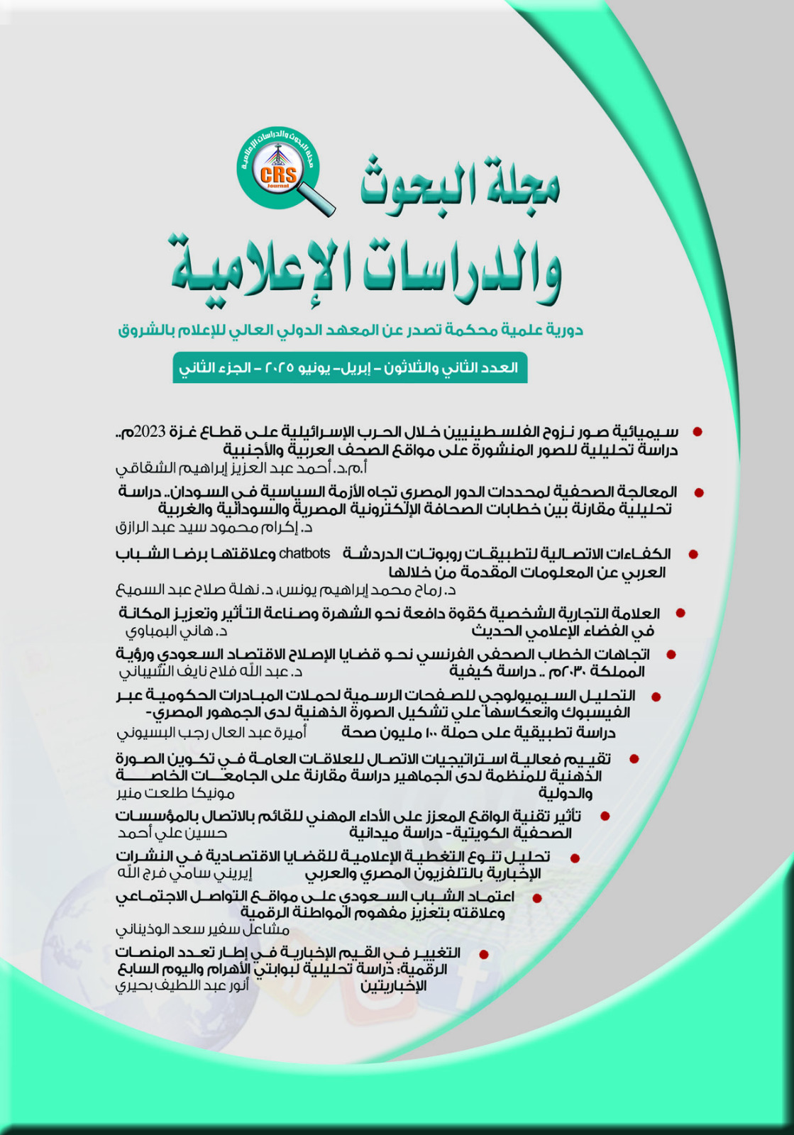 أعلن المعهد الدولي العالي للإعلام بأكاديمية الشروق عن صدور العدد الجديد من مجلة البحوث والدراسات الإعلامية، والذي يحمل رقم (32) للربع الثاني من عام 2025 (إبريل – يونيو)، متضمنًا مجموعة من البحوث العلمية المحكمة التي تعكس تنوعًا في القضايا والمعالجات وأساليب التحليل، وتمثل إضافة حقيقية للمعرفة العلمية في مجالات الإعلام والاتصال.