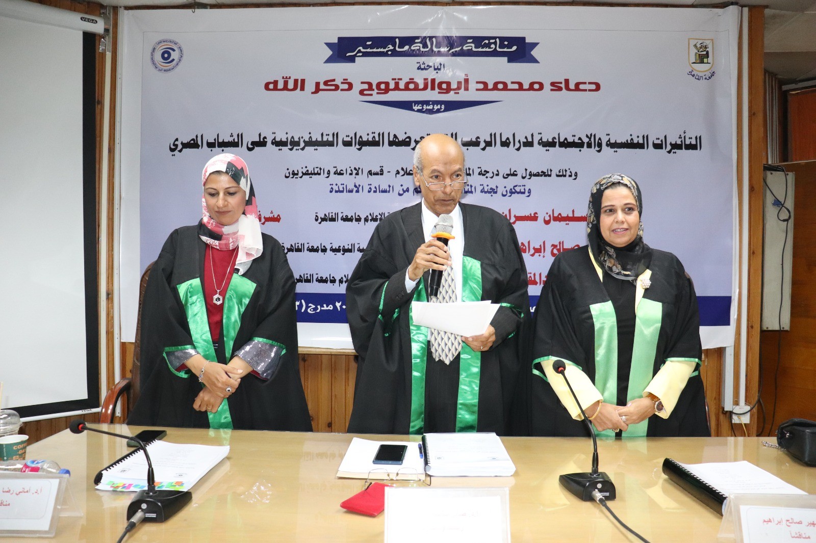 وشارك في لجنة المناقشة، الدكتورة أماني رضا، مدير مركز التدريب والتوثيق والإنتاج الإعلامي بالكلية، كما شاركت في الإشراف الدكتورة نجلاء حامد، المدرس بقسم الإذاعة والتلفزيون.