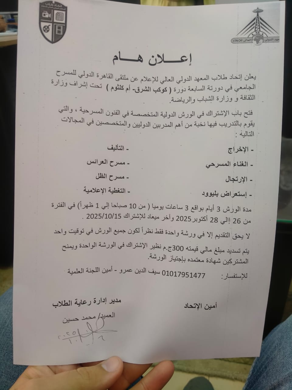 أعلن اتحاد طلاب المعهد الدولي العالي للإعلام عن انطلاق فعاليات ملتقى القاهرة الدولي للمسرح الجامعي في دورته السابعة، والتي تُقام هذا العام تحت عنوان “دورة كوكب الشرق أم كلثوم”، تحت إشراف وزارة الثقافة ووزارة الشباب والرياضة، بمشاركة نخبة من الفنانين والمتخصصين في مجالات الفنون المسرحية.