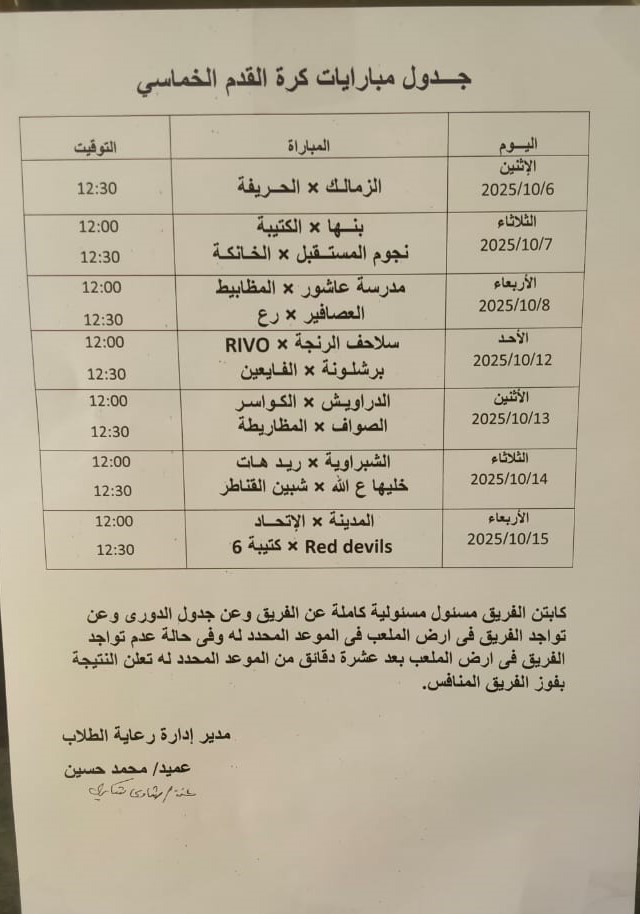 كما يشهد يوم الأربعاء 8 أكتوبر لقاءين بين مدرسة عاشور × المظابيط والعصافير × رع، وتستأنف المنافسات يوم الأحد 12 أكتوبر بمباراتي سلاحف الرنجة × RIVO وبرشلونة × الفايعين، ثم يوم الإثنين 13 أكتوبر بلقاءي الدراويش × الكواسر والصواف × المظاريطة، ويختتم الأسبوع يوم الثلاثاء 14 أكتوبر بمواجهتي الشبراوية × ريد هات وخليها ع الله × شبين القناطر، على أن تُختتم المنافسات يوم الأربعاء 15 أكتوبر بمباراتي المدينة × الاتحاد و6 كتيبة × Red Devils.
