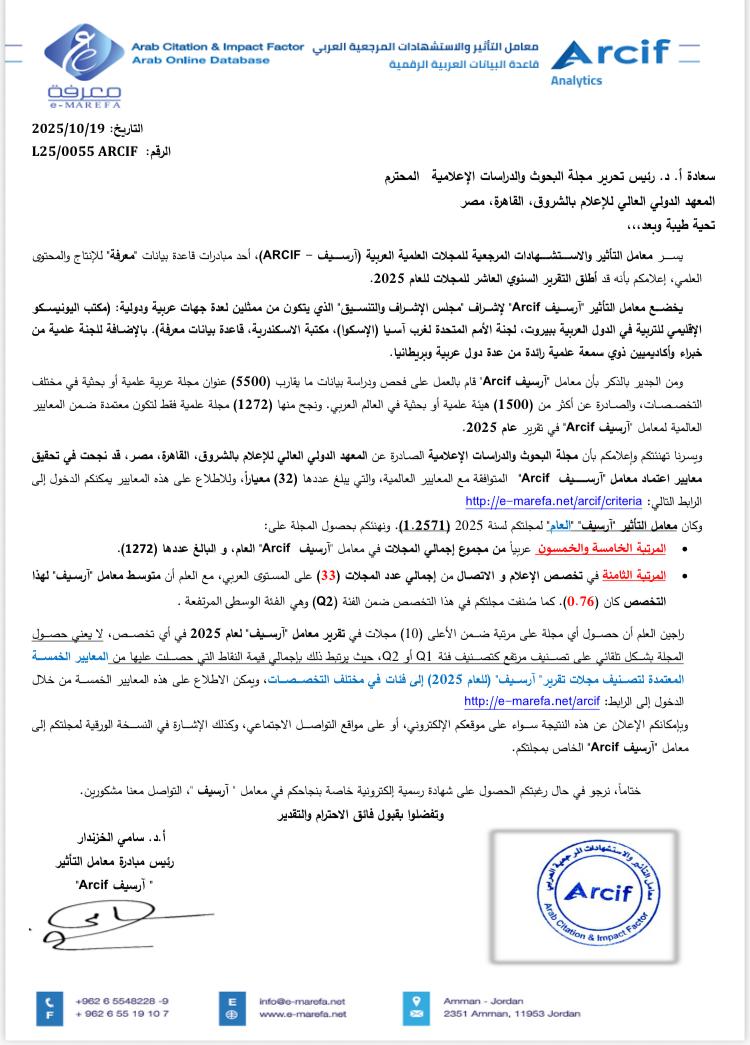 حققت مجلة البحوث والدراسات الإعلامية الصادرة عن المعهد الدولي العالي للإعلام بالشروق إنجازًا أكاديميًا بارزًا على مستوى الوطن العربي، بعد أن احتلت المرتبة الثامنة في تخصص الإعلام والاتصال من بين 33 مجلة عربية متخصصة، وفقًا لتقرير معامل التأثير والاستشهادات المرجعية العربي (ARCIF) لعام 2025، كما صُنّفت ضمن الفئة (Q2) وهي الفئة الوسطى المرتفعة التي تضم أبرز المجلات الأكاديمية في هذا المجال.