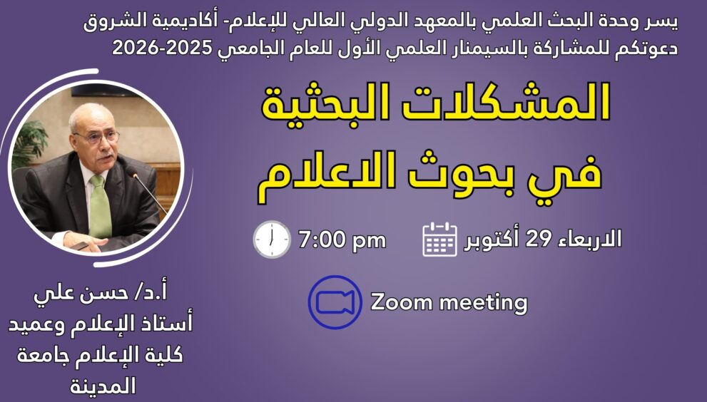 تعلن وحدة البحث العلمي بالمعهد الدولي العالي للإعلام بأكاديمية الشروق عن تنظيم السيمنار العلمي الأول للعام الجامعي 2025-2026 بعنوان “المشكلات البحثية في بحوث الإعلام”، وذلك يوم الأربعاء الموافق 29 أكتوبر في تمام الساعة السابعة مساءً عبر تطبيق Zoom.