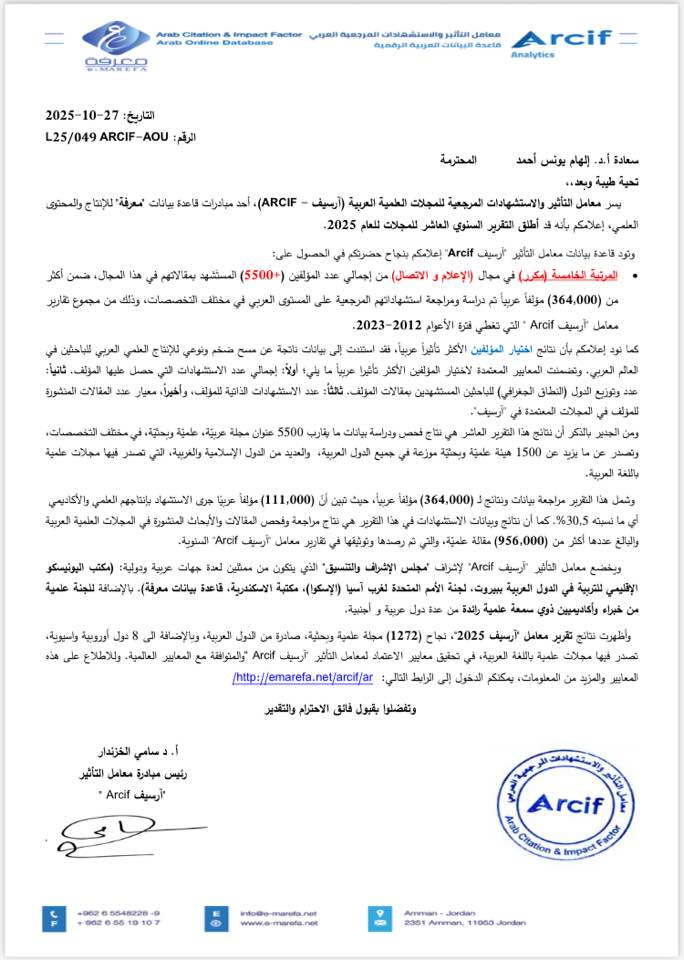 في إنجاز أكاديمي جديد، حصلت الدكتورة إلهام يونس أحمد، وكيلة المعهد الدولي العالي للإعلام بأكاديمية الشروق، على المرتبة الخامسة (مكرر) على مستوى الوطن العربي في قائمة المؤلفين الأكثر تأثيرًا في مجال الإعلام والاتصال لعام 2025، وذلك وفقًا لتقرير معامل التأثير والاستشهادات المرجعية العربي (ARCIF)، أحد مبادرات قاعدة البيانات العربية الرقمية “معرفة”.