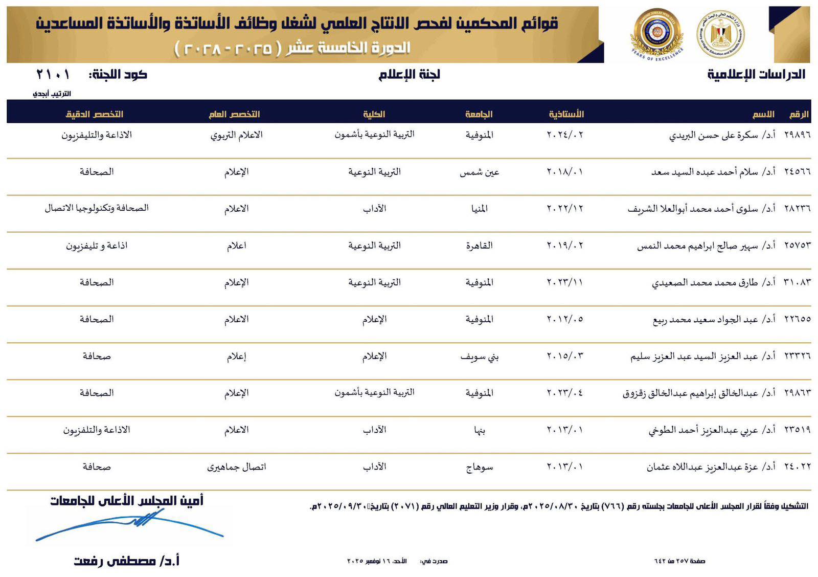 ويعد تجديد اختيارها ضمن المحكّمين تأكيدًا على المكانة العلمية التي تحظى بها، ودورها في دعم معايير الجودة والتميز في تقييم الأبحاث والإنتاج العلمي داخل كليات وأقسام الإعلام على مستوى الجامعات المصرية.