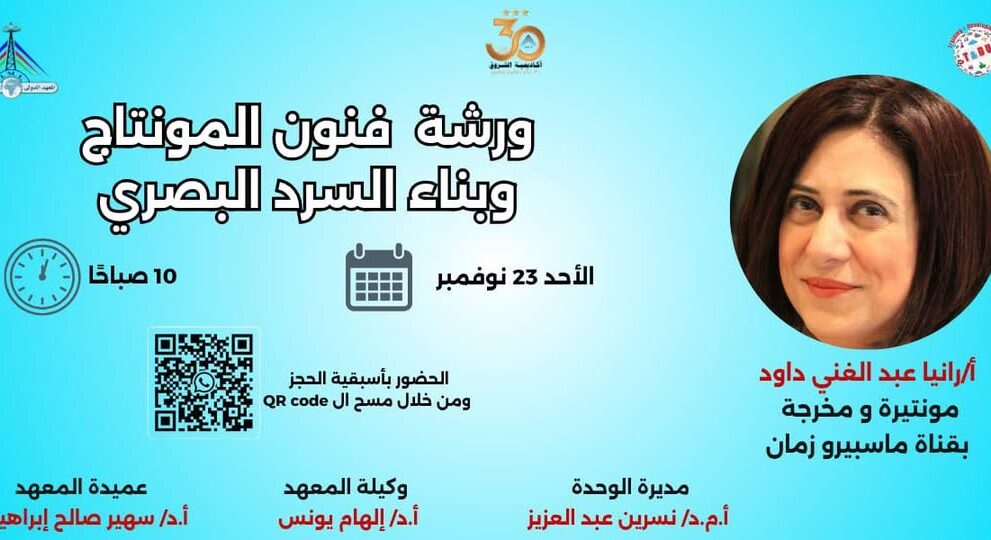 وتقدّم الورشة رانيا عبدالغني، المونتيرة بقناة ماسبيرو زمان، حيث ستتناول أسس المونتاج، وآليات بناء السرد البصري، وكيفية تحويل الفكرة إلى مادة مرئية متكاملة وفق الأساليب المهنية المتبعة في العمل التلفزيوني.