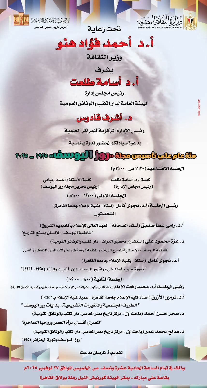 تنظم وزارة الثقافة، برعاية د. أحمد فؤاد هنو، وزير الثقافة، وبإشراف الهيئة العامة لدار الكتب والوثائق القومية برئاسة د. أسامة طلعت، ندوة موسعة احتفالًا بمرور مئة عام على تأسيس مجلة “روز اليوسف” (1925–2025)، وذلك غدًا الخميس، الساعة الحادية عشرة والنصف صباحًا بقاعة علي مبارك بمقر الهيئة على كورنيش النيل برملة بولاق.