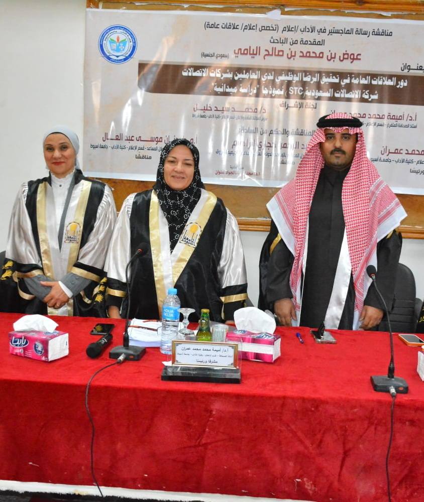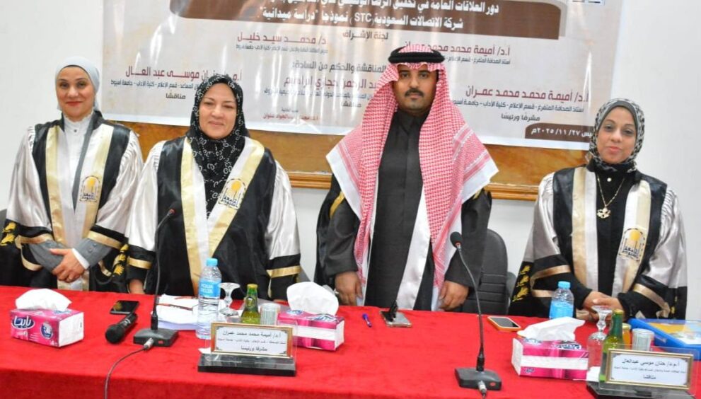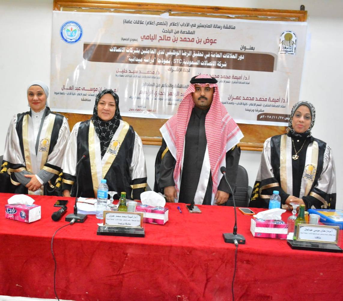 وتناولت الرسالة المقدمة من الباحث عوض محمد صالح اليامي موضوع: “دور العلاقات العامة في تحقيق الرضا الوظيفي لدى العاملين بشركات الاتصالات – شركة الاتصالات السعودية STC نموذجًا”، حيث دارت جلسة المناقشة في إطار علمي اتسم بالثراء وتبادل الرؤى البحثية المتخصصة.