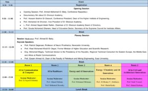 ويتضمن برنامج المؤتمر جلسات متوازية تعقد في خمس قاعات، وتتناول محاور متنوعة تشمل الذكاء الاصطناعي والرؤية الذكية للبناء والبنية التحتية والبيئة، تطبيقات الذكاء الاصطناعي في الرعاية الصحية والطاقة الذكية، ابتكارات الذكاء الاصطناعي في الهندسة، التكنولوجيا الذكية والمتقدمة في المدن، تقينات الذكاء الاصطناعي في العمليات الكيميائية، الابتكارات وتحسين الأداء في الإلكترونيات وأنظمة الاتصالات الذكية، دور الذكاء الاصطناعي في تصميم وتحسين أنظمة الحاسوب، ويترأس كل جلسة مجموعة من الأساتذة المتخصصين.