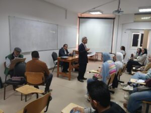 قدم الورشة الدكتور ثروت فتحي، أستاذ الصحافة بكلية التربية النوعية جامعة القاهرة، من منظور إبداعي وثقافي حيث استعرض خلالها مفهوم فن الكاريكاتير وتطوره على المستوى العالمي، وبداياته في مصر، موضحًا أن رسم الكاريكاتير يقترب كثيرًا من المبدع، باعتباره رؤية إبداعية للفنان ورؤية خاصة للحدث، مشيرًا إلى أن رسام الكاريكاتير يقترب في جوهره من الفنان التشكيلي.