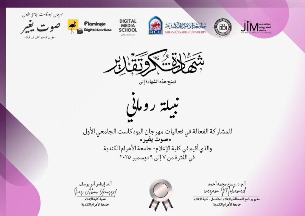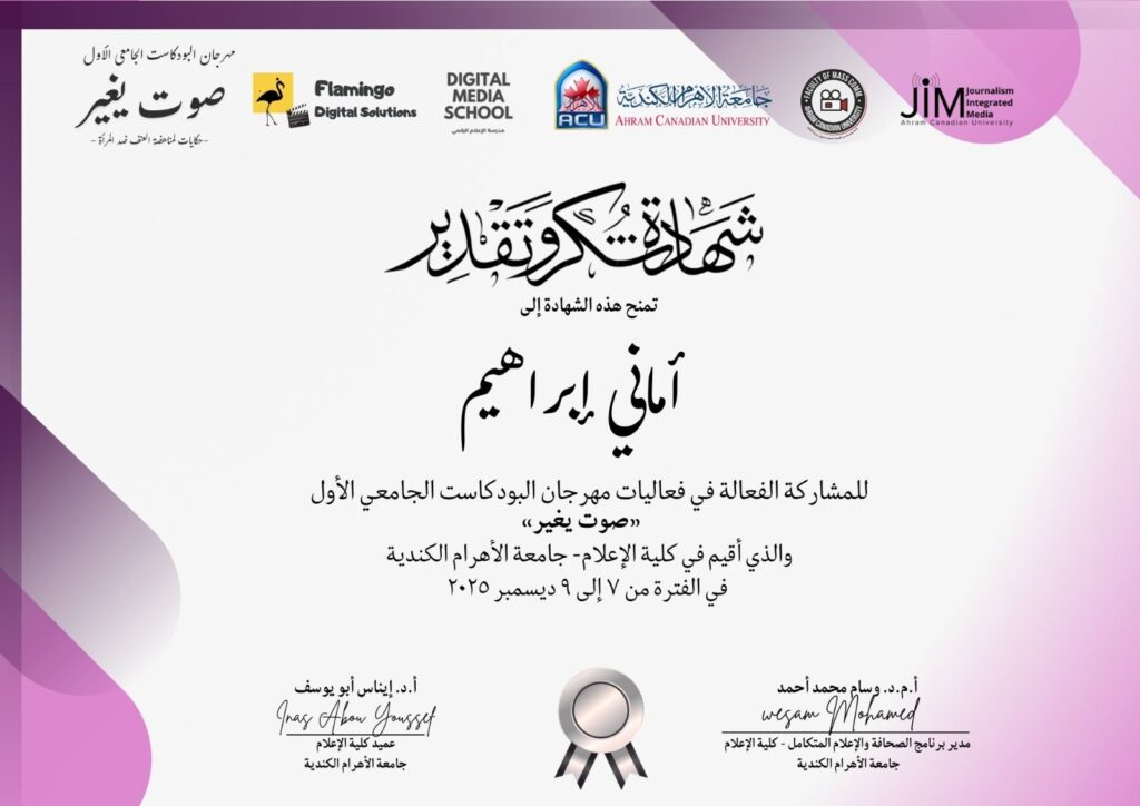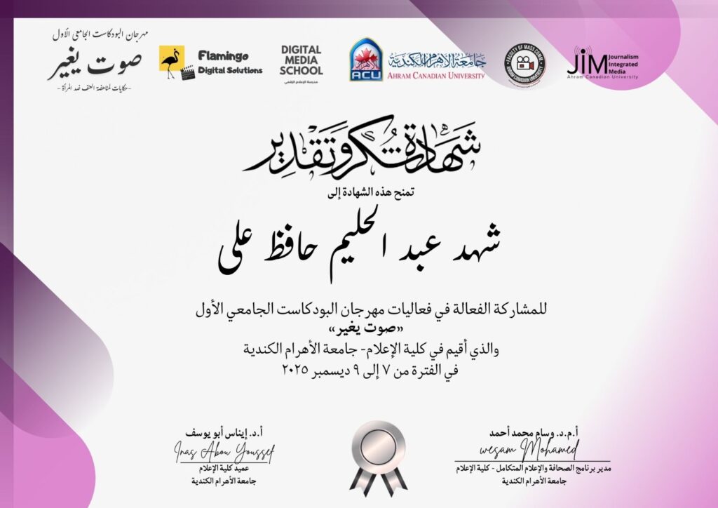 وحصل الطلاب المشاركون على شهادات شكر وتقدير، تقديرًا لمشاركتهم الفعّالة في فعاليات مهرجان البودكاست الجامعي الأول «صوت يغير»، والذي أُقيم بكلية الإعلام في جامعة الأهرام الكندية خلال الفترة من 7 إلى 9 ديسمبر 2025.