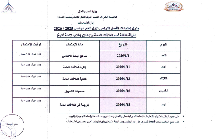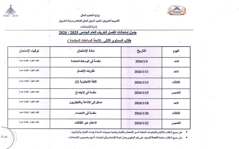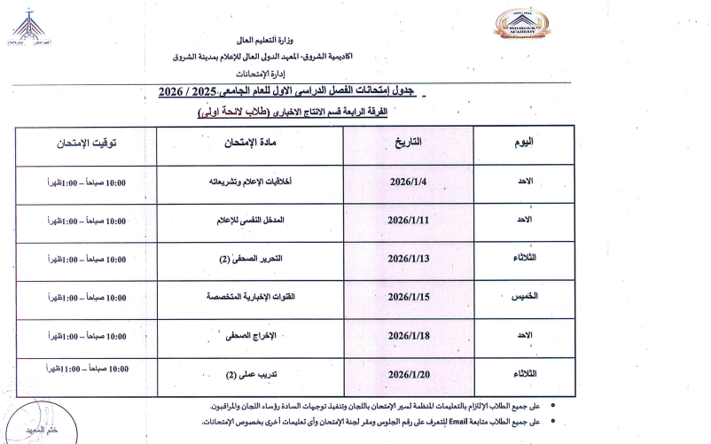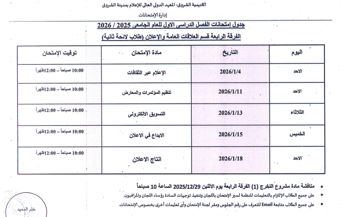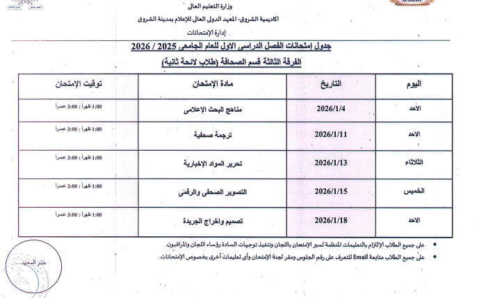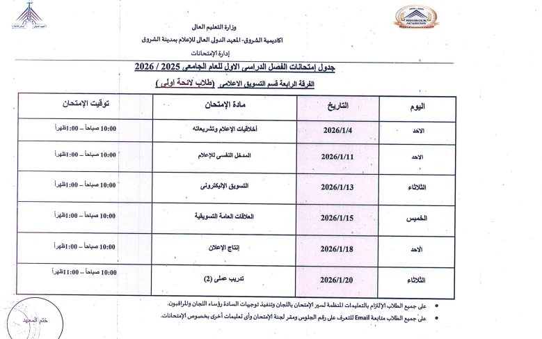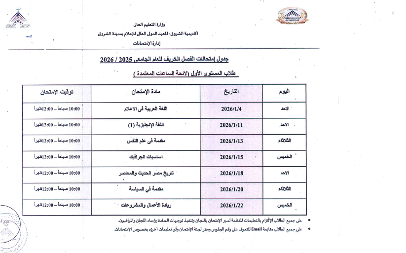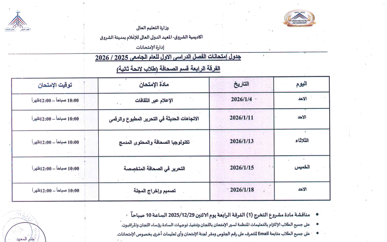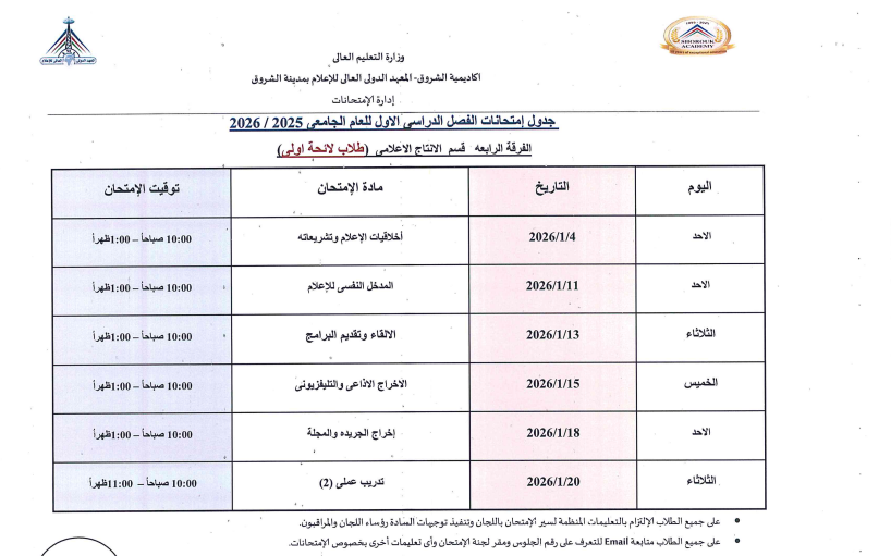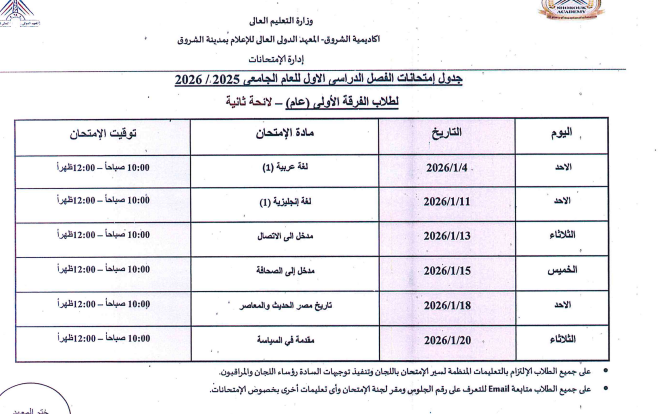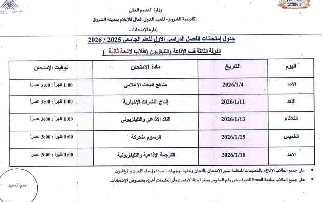 اعتمدت د. سهير صالح إبراهيم، عميدة المعهد الدولي العالي للإعلام بأكاديمية الشروق، جدول امتحانات الفصل الدراسي الأول للعام الجامعي 2025/ 2026، وذلك لطلاب اللائحة الأولى، واللائحة الثانية، ولائحة الساعات المعتمدة، بجميع الفرق الدراسية الأولى والثانية والثالثة والرابعة بمختلف التخصصات.