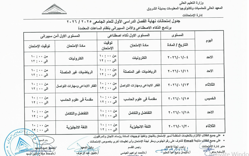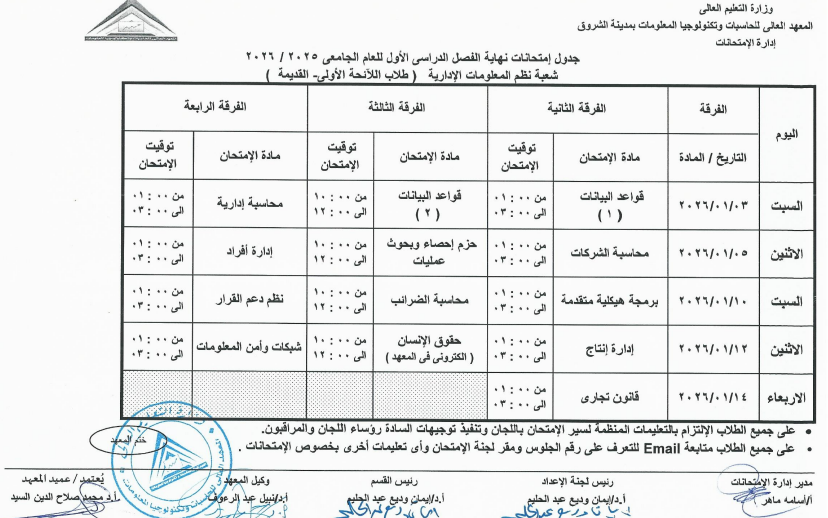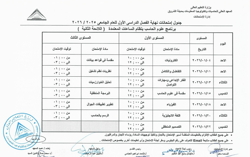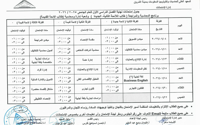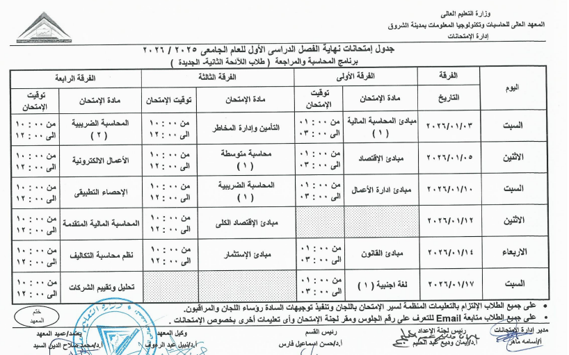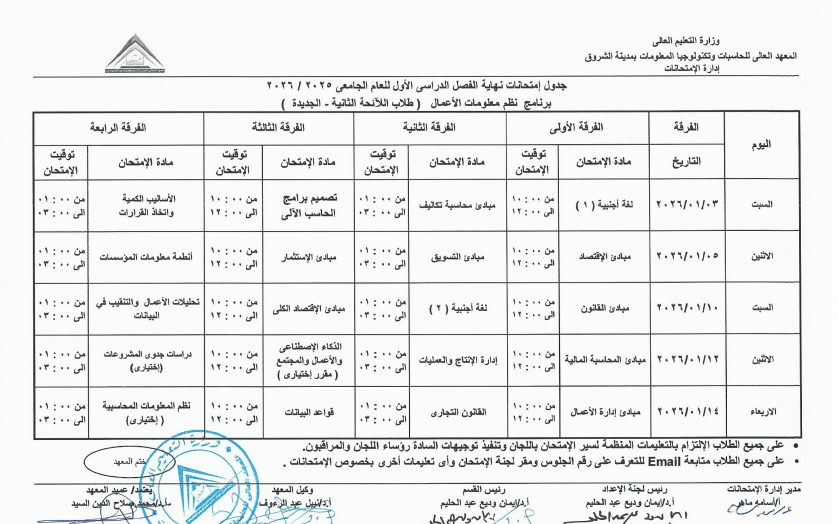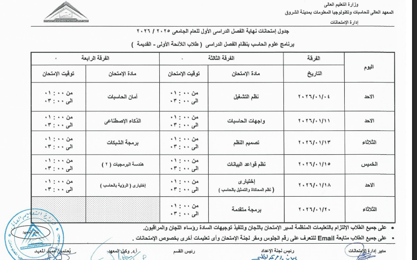 اعتمد الدكتور محمد صلاح، عميد المعهد العالي للحاسبات وتكنولوجيا المعلومات بالشروق، جدول امتحانات الفصل الدراسي الأول للعام الجامعي 2025 / 2026، وذلك لطلاب اللائحة الأولى، واللائحة الثانية، ولائحة الساعات المعتمدة، بجميع الفرق الدراسية الأولى والثانية والثالثة والرابعة.
