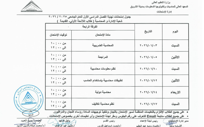 كما تنطلق امتحانات المواد النظرية يوم السبت 3 يناير 2026، وتستمر حتى يوم الخميس 22 يناير 2026، وفقًا للجدول المعتمد من إدارة المعهد.