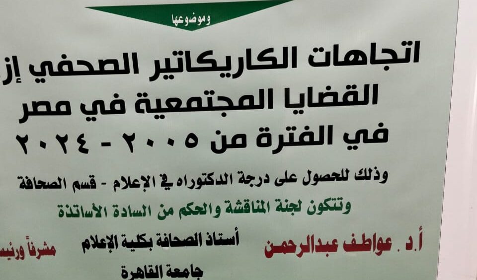 رسالة الدكتوراة بعنوان “اتجاهات الكاريكاتير الصحفي إزاء القضايا المجتمعية في مصر في الفترة من ٢٠٠٥ – ٢٠٢٤” من إعداد الباحثة ندى عبد الحكم النجار، وجاءت تحت إشراف د.عواطف عبد الرحمن، أستاذ الصحافة بكلية الإعلام جامعة القاهرة.