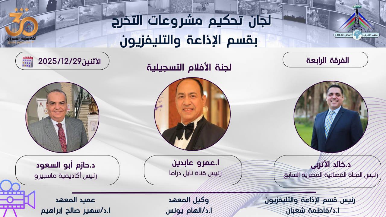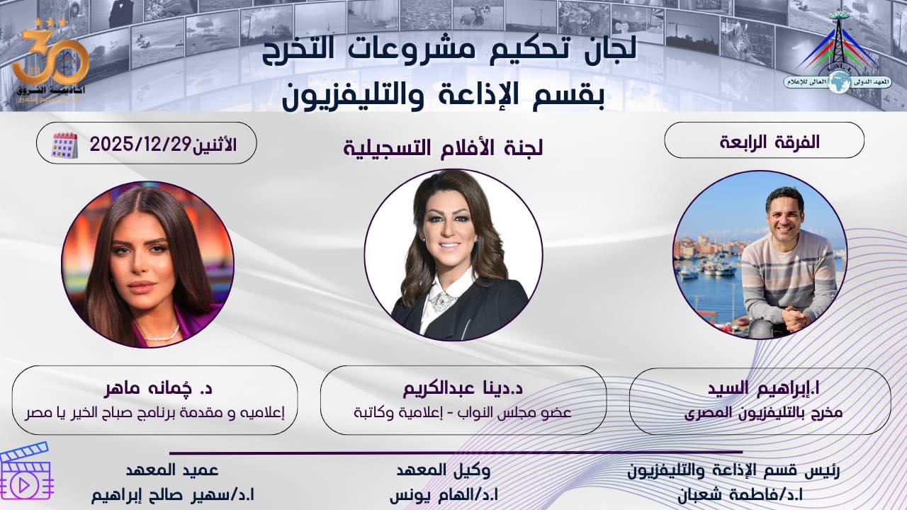 أكدت د. فاطمة شعبان رئيسة القسم، أن تشكيل لجان تحكيم متنوعة من كبار المتخصصين يأتي في إطار حرص المعهد على تقديم تقييم مهني دقيق لمشروعات التخرج، ودعم الطلاب بخبرات عملية تؤهلهم للانطلاق بقوة في سوق العمل الإعلامي.