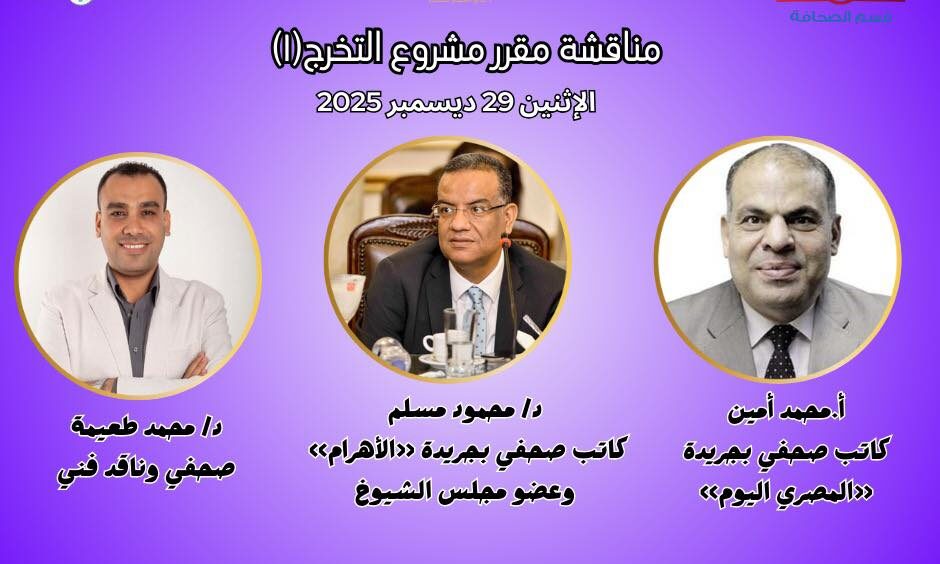 ينظم قسم الصحافة بالمعهد الدولي العالي للإعلام بأكاديمية الشروق، برئاسة د. رامي عطا صديق رئيس القسم، مناقشة مقرر «مشروع التخرج (1)» لطلاب الفرقة الرابعة، وذلك غدًا الإثنين 29 ديسمبر الجارى.