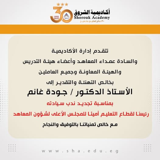 وأعربت أكاديمية الشروق عن خالص تمنياتها لسيادته بدوام التوفيق والنجاح، واستمرار عطائه في خدمة قطاع التعليم العالي، متمنية له مزيدًا من الإنجازات خلال الفترة المقبلة.