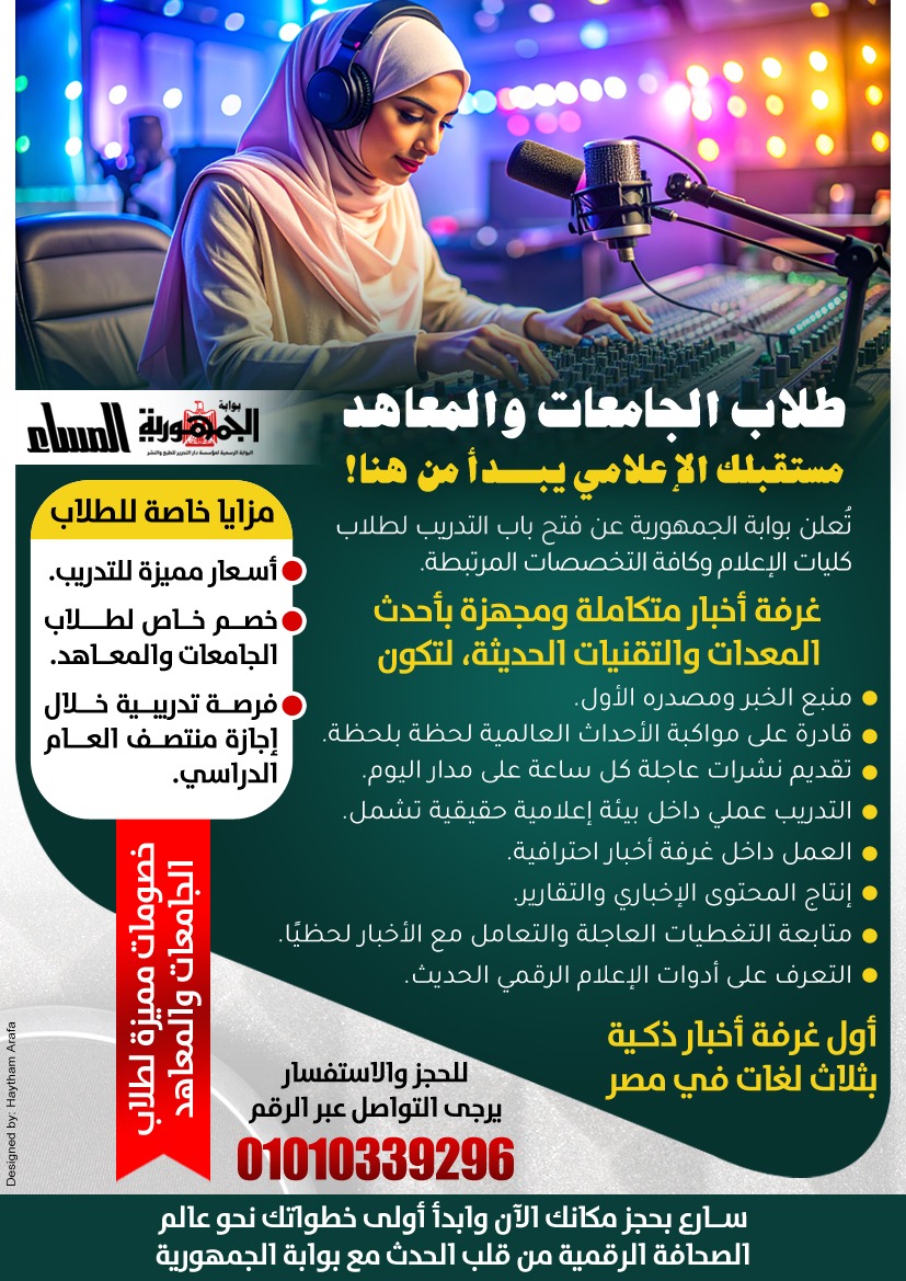 وأعلنت بوابة الجمهورية عن تقديم أسعار تدريب مميزة، وخصومات خاصة لطلاب الجامعات والمعاهد، في إطار البروتوكول الموقع مع المعهد الدولي العالي للإعلام بأكاديمية الشروق، دعمًا للطلاب وتشجيعًا لهم على اكتساب الخبرات العملية.