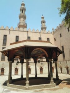 - صحن مكشوف في الوسط مستطيل الشكل، مكشوف للسماء، وكان يُستخدم: كعنصر تهوية وإنارة طبيعية، لاستيعاب المصلين للوضوء والتجمع وتحيط به أروقة ذات عقود حجرية مدببة، تعكس الطابع المملوكي الواضح.