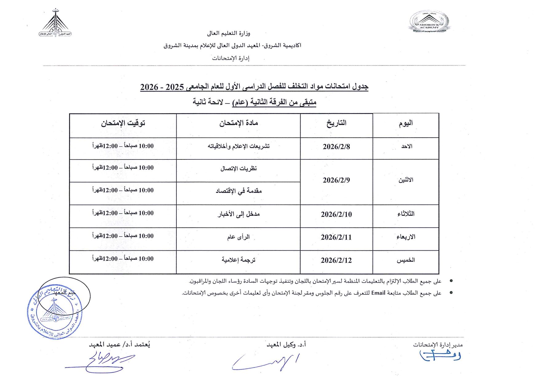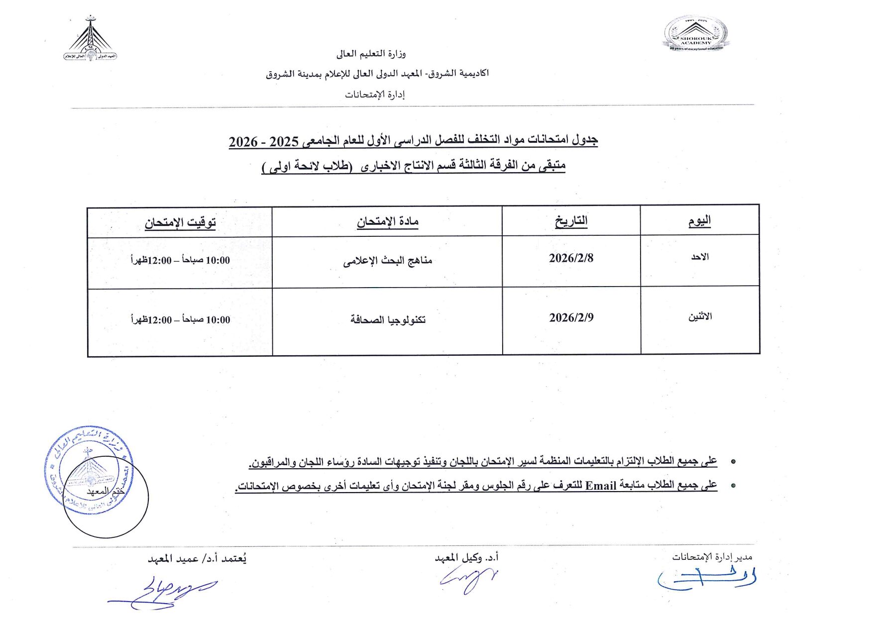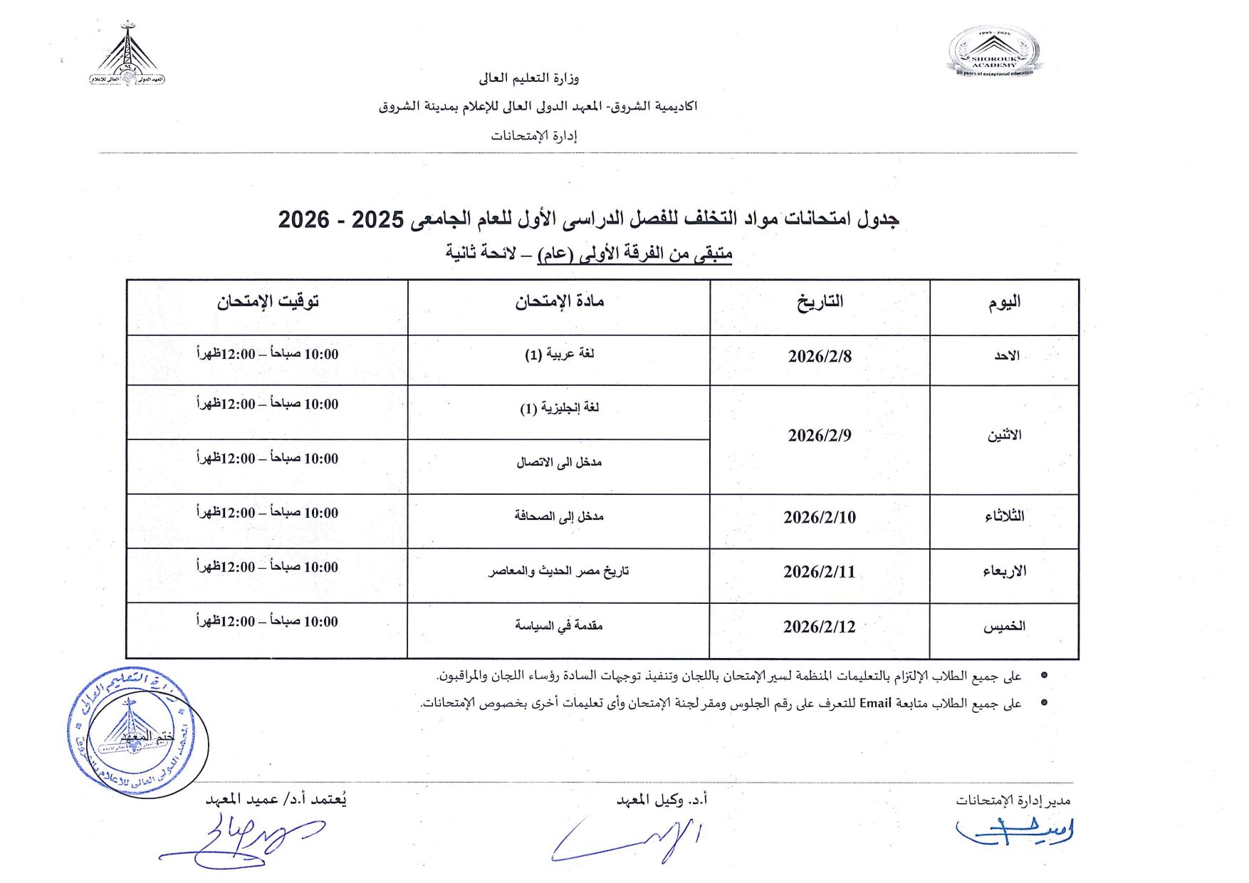 أعلن المعهد الدولي العالي للإعلام بأكاديمية الشروق جدول امتحانات تخلفات الفصل الدراسي الأول للعام الجامعي 2025/2026، وذلك لجميع طلاب الفرق الأولى والثانية والثالثة والرابعة.