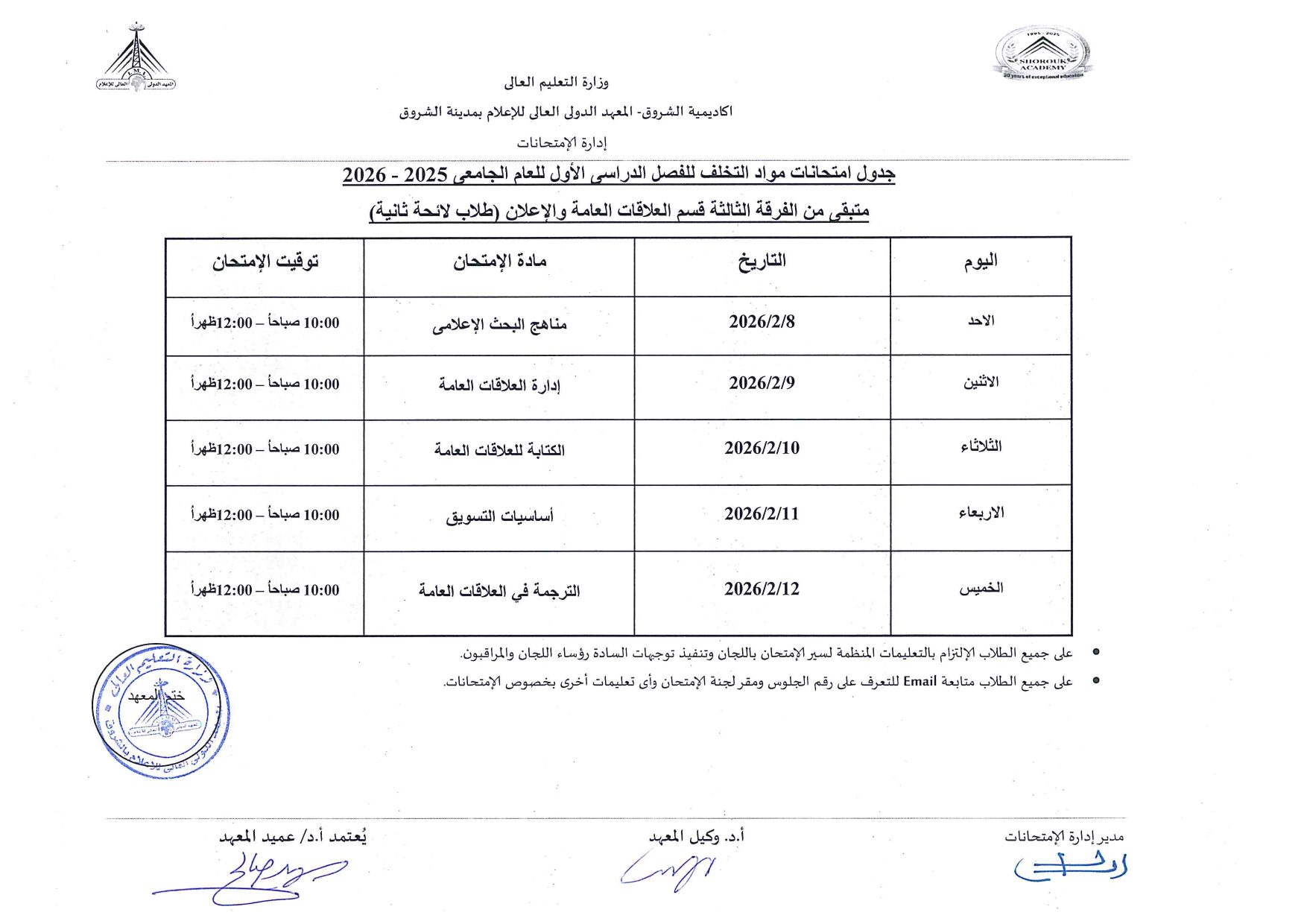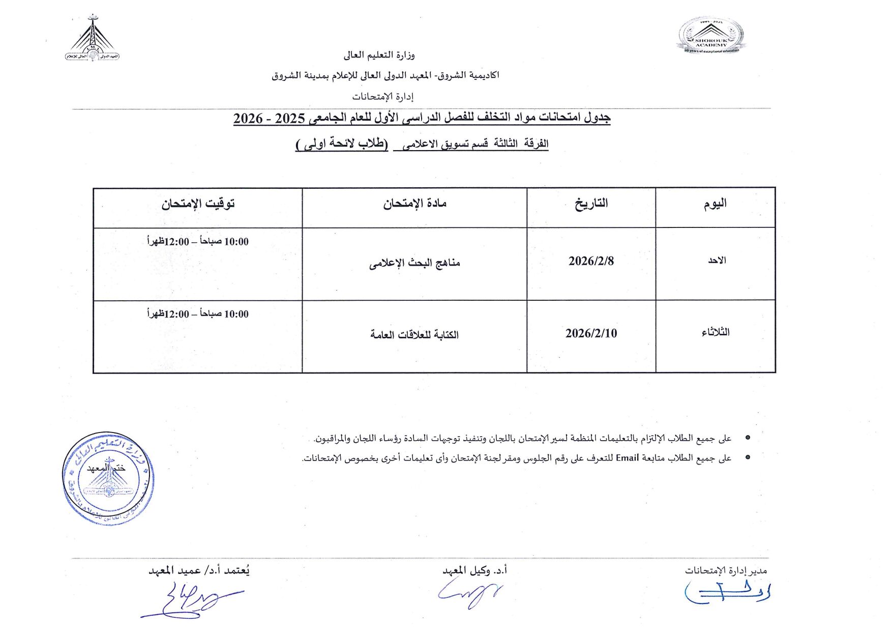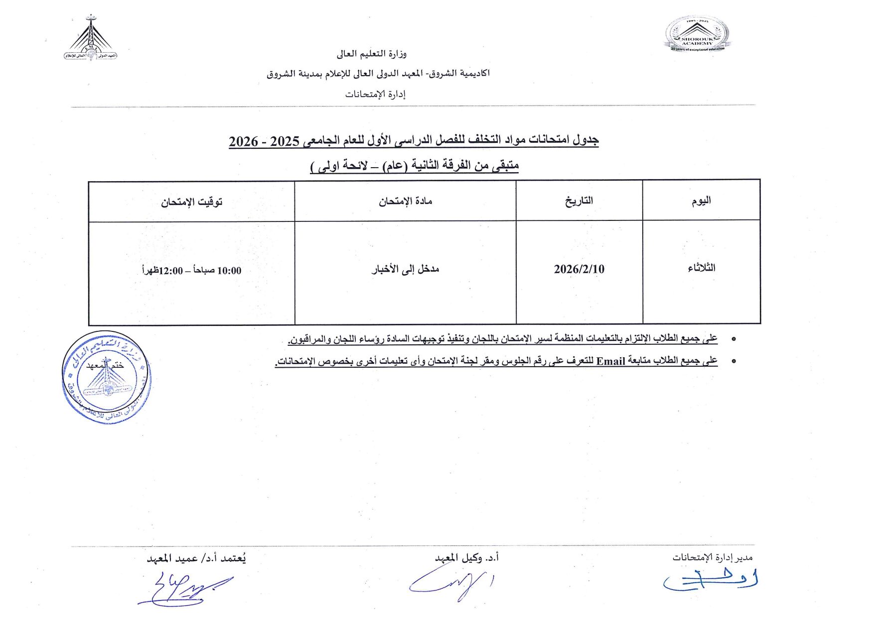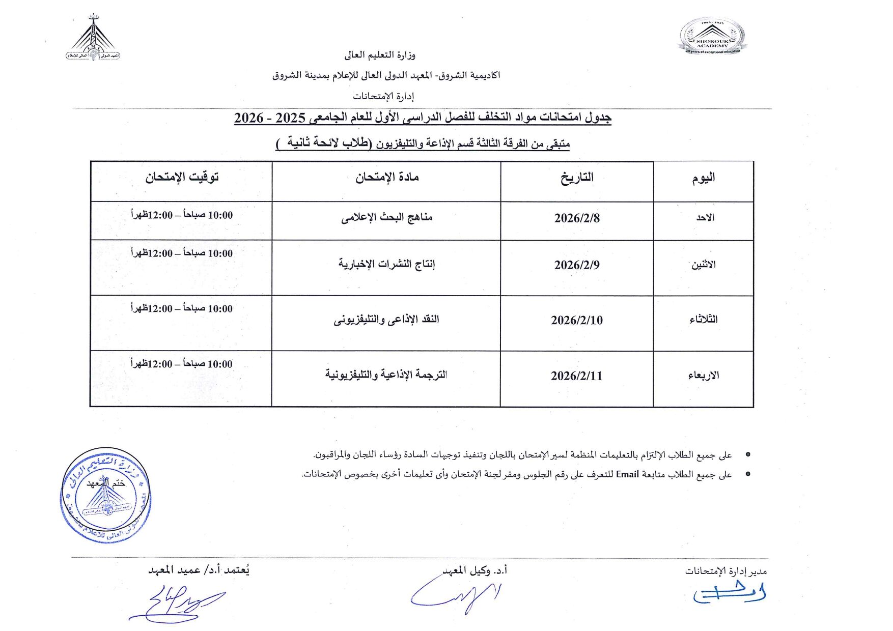 أعلن المعهد الدولي العالي للإعلام بأكاديمية الشروق جدول امتحانات تخلفات الفصل الدراسي الأول للعام الجامعي 2025/2026، وذلك لجميع طلاب الفرق الأولى والثانية والثالثة والرابعة.