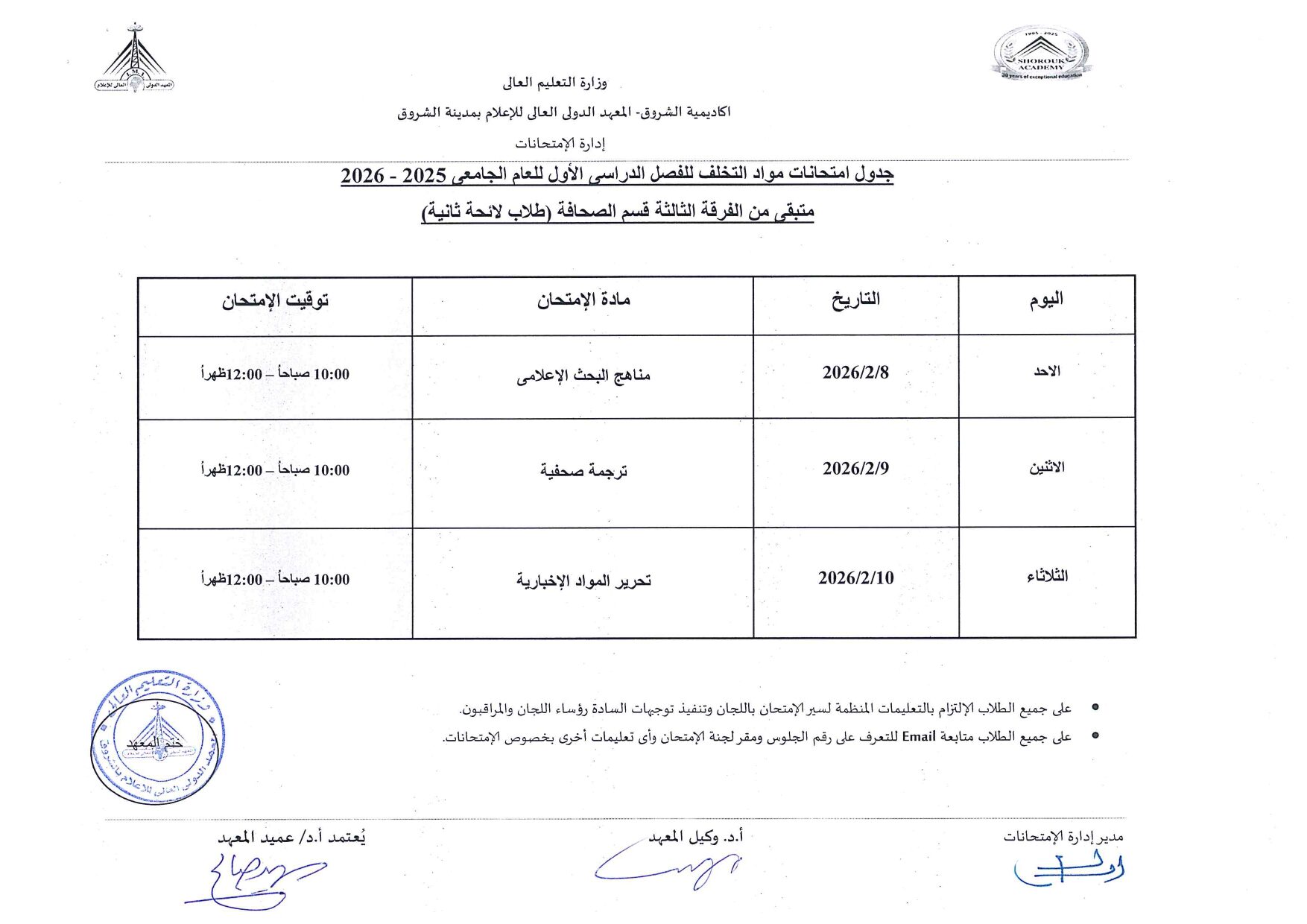وأوضح المعهد أن الامتحانات تشمل أقسام الإذاعة والتليفزيون، والعلاقات العامة، والصحافة، على أن تُعقد خلال الفترة من يوم الأحد الموافق 8 فبراير وحتى يوم الخميس الموافق 12 فبراير.