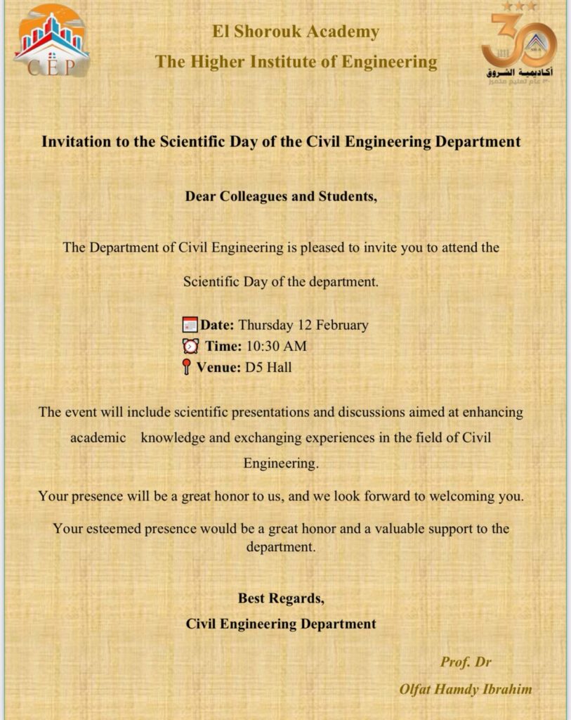ينظم المعهد العالي للهندسة بأكاديمية الشروق، يوم الخميس الموافق 12 فبراير، المؤتمر العلمي لقسم الهندسة المدنية، وذلك في تمام الساعة العاشرة صباحًا بقاعة د5، بمشاركة نخبة من أعضاء هيئة التدريس والمهندسين والطلاب، في إطار حرص المعهد على دعم البحث العلمي وتعزيز التواصل بين الجوانب الأكاديمية والتطبيقية في المجال الهندسي.