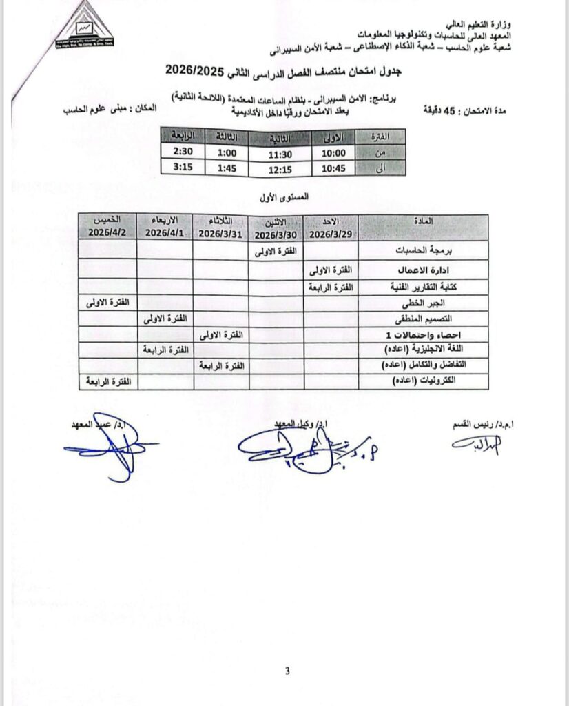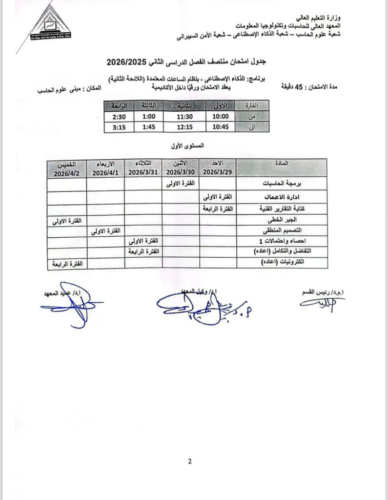 المعهد العالي للحاسبات يعلن جدول “الميدترم” لطلاب علوم الحاسب والذكاء الاصطناعي والأمن السيبراني