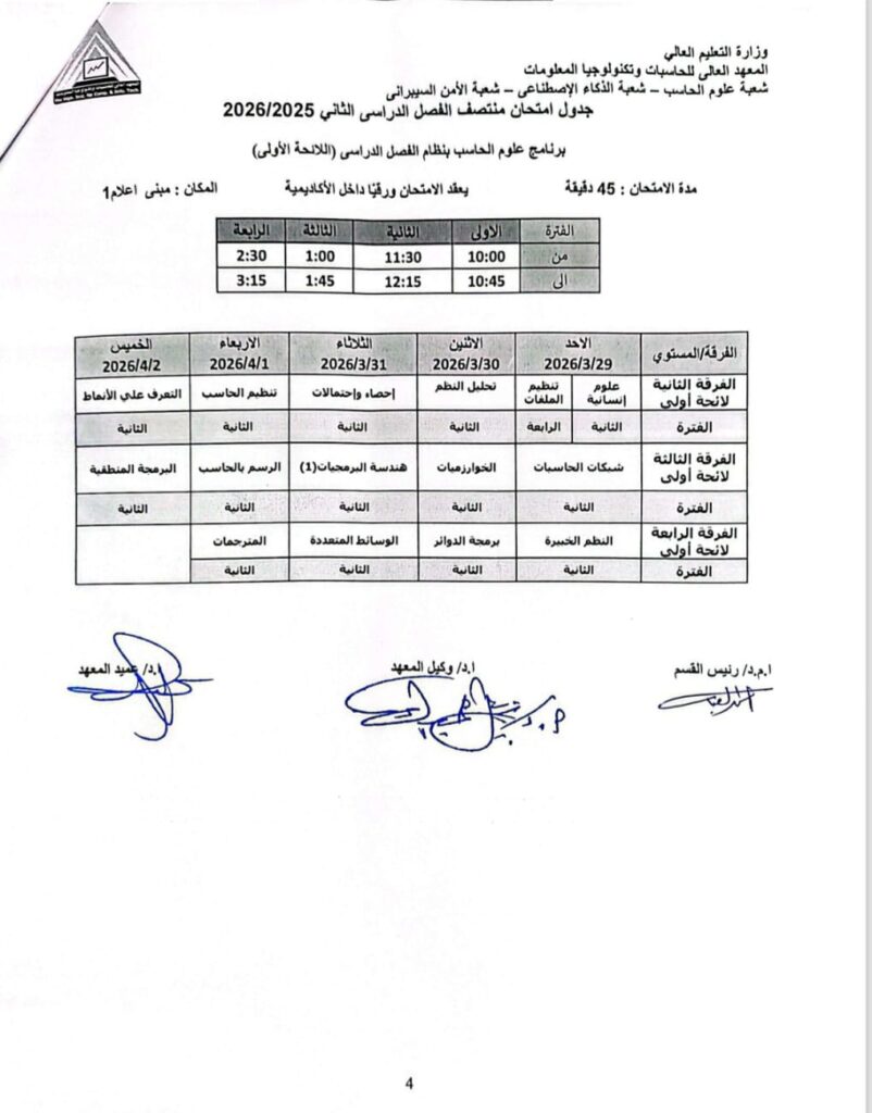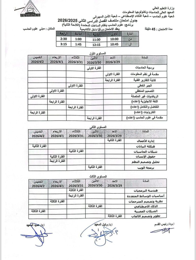 وأوضح المعهد أن جدول الامتحانات يشمل عددًا من البرامج الدراسية، من بينها برنامج علوم الحاسب بنظام الساعات المعتمدة (اللائحة الثانية)، وبرنامج علوم الحاسب بنظام الفصل الدراسي (اللائحة الأولى)، إلى جانب برنامج الذكاء الاصطناعي بنظام الساعات المعتمدة (اللائحة الثانية)، وبرنامج الأمن السيبراني بنظام الساعات المعتمدة (اللائحة الثانية).