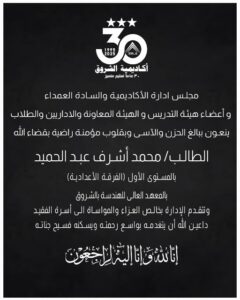 نعت أكاديمية الشروق ببالغ الحزن والأسى الطالب محمد أشرف عبد الحميد، المقيد بالمستوى الأول بالفرقة الإعدادية بالمعهد العالي للهندسة، والذي وافته المنية .