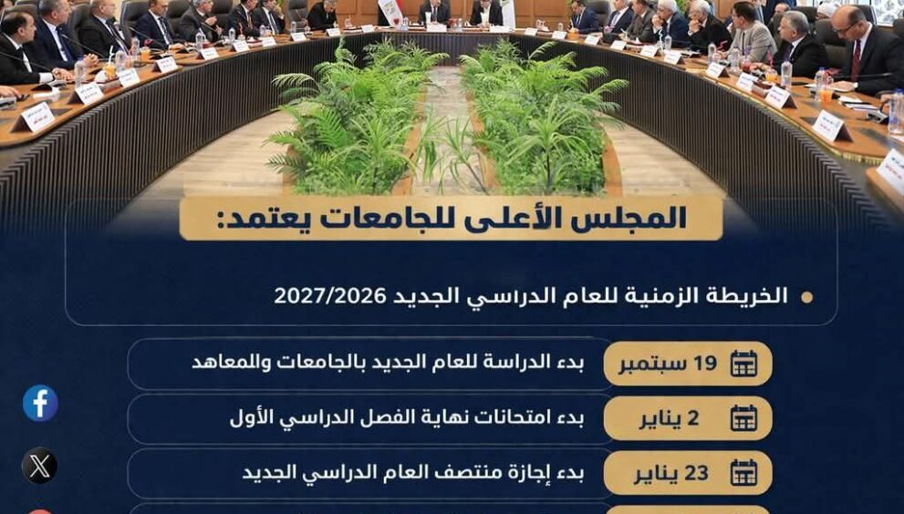 اعتمد المجلس الأعلى للجامعات الخريطة الزمنية للعام الدراسي الجديد 2026/ 2027 بالجامعات والمعاهد، متضمنة مواعيد بدء الدراسة، والامتحانات، والإجازات الرسمية.