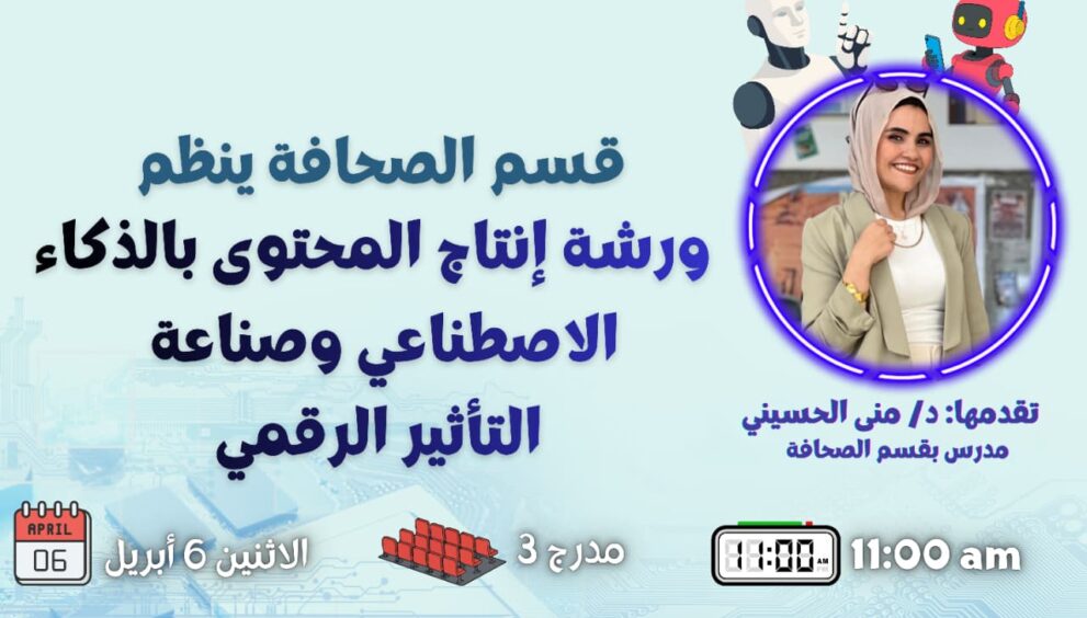 وتُحاضر الورشة الدكتورة منى الحسيني، المدرس بقسم الصحافة، تحت إشراف الدكتور رامي عطا رئيس قسم الصحافة، حيث تستهدف تعريف الطلاب بأحدث أدوات وتقنيات إنتاج المحتوى باستخدام الذكاء الاصطناعي، وآليات صناعة التأثير الرقمي عبر المنصات المختلفة، بما يسهم في إعداد كوادر إعلامية قادرة على التفاعل مع متغيرات العصر الرقمي.