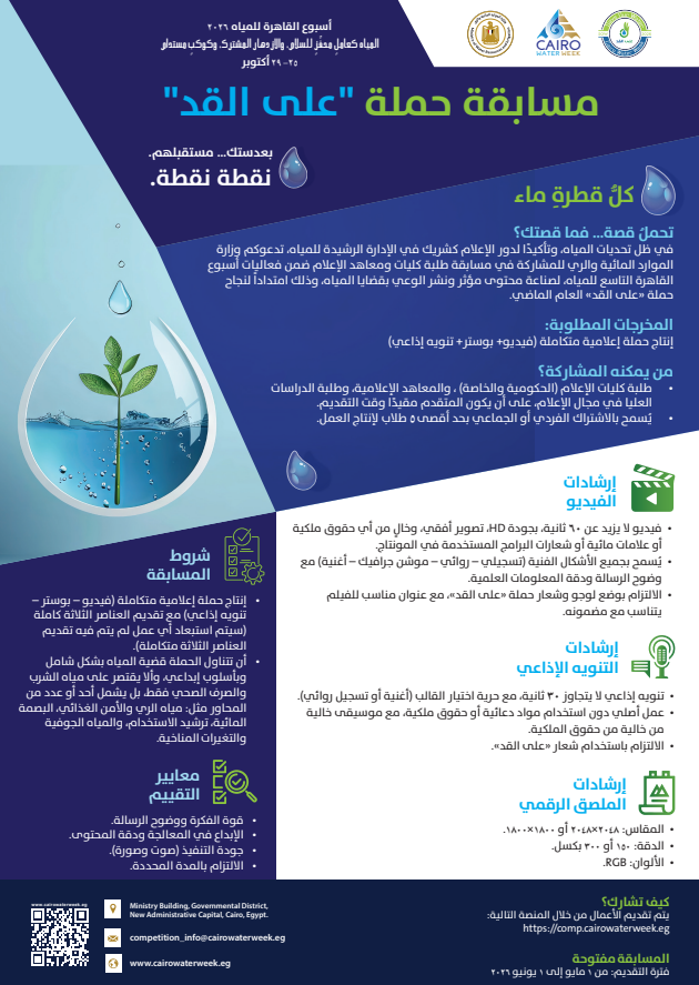 أعلنت اللجنة المنظمة لـأسبوع القاهرة للمياه 2026 إطلاق مسابقة «على القد»، في إطار الجهود الرامية إلى نشر ثقافة ترشيد استهلاك المياه وتعزيز الوعي المجتمعي بأهمية الحفاظ على الموارد المائية.