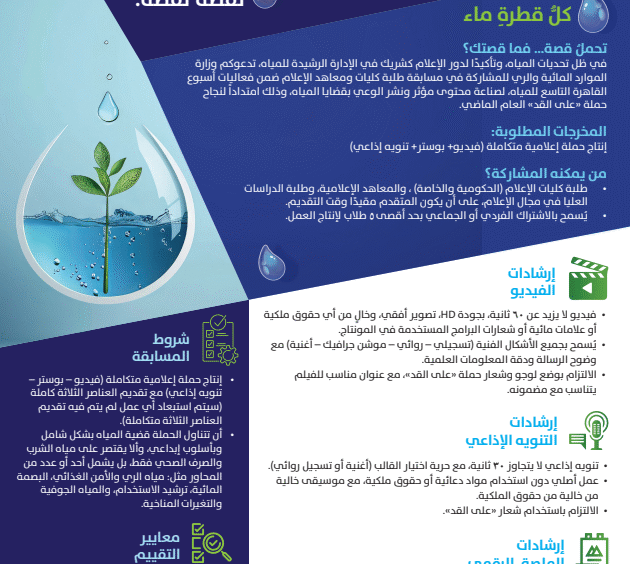 وتأتي المسابقة تحت شعار «كل قطرة ماء تحمل قصة.. فما قصتك؟»، حيث تستهدف تشجيع المبدعين وطلاب الجامعات والمعاهد على تقديم محتوى إعلامي مبتكر يسهم في دعم قضايا المياه والاستدامة.