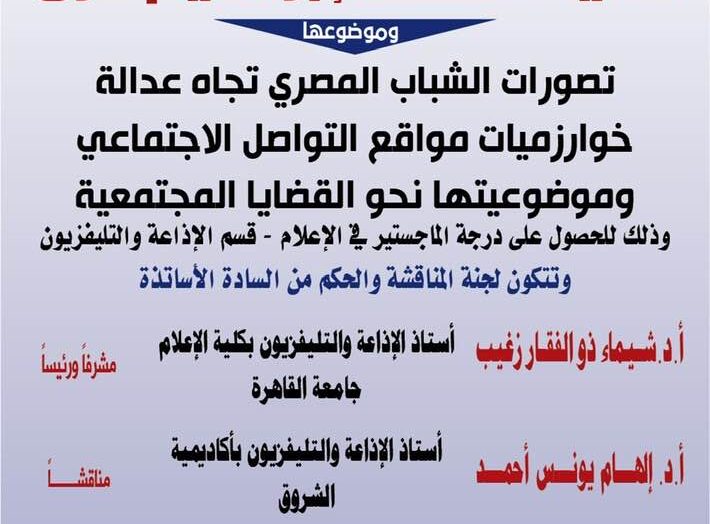كتب- محمد منصور: ناقشت د. الهام يونس وكيلة المعهد الدولي العالي للإعلام بالشروق، رسالة ماجستير للباحثة عاليا مسعد إبراهيم غزل، بعنوان “تصورات الشباب المصري تجاه عدالة خوارزميات مواقع التواصل الاجتماعي وموضوعيتها نحو القضايا المجتمعية”، وذلك للحصول على درجة الماجستير في الإعلام قسم الإذاعة والتليفزيون. تكونت لجنة المناقشة من د. شيماء ذو الفقار زغيب أستاذ […]