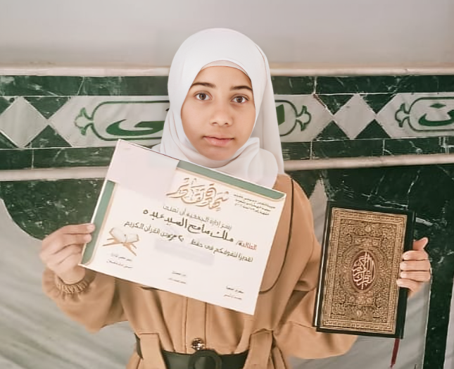 تكريم الطالبة ملك سامح السيد عبده بيومي جاد الله لحصولها على المركز الأول في مسابقة حفظ القرآن الكريم